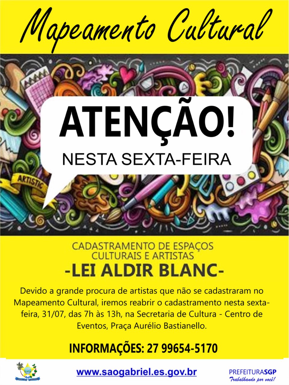 A Prefeitura deSão Gabriel daPalha, por meio da Secretaria Municipal de Cultura, vai reabrir nesta sexta-feira 31, o recadastramento de espaços culturais e artistas locais,