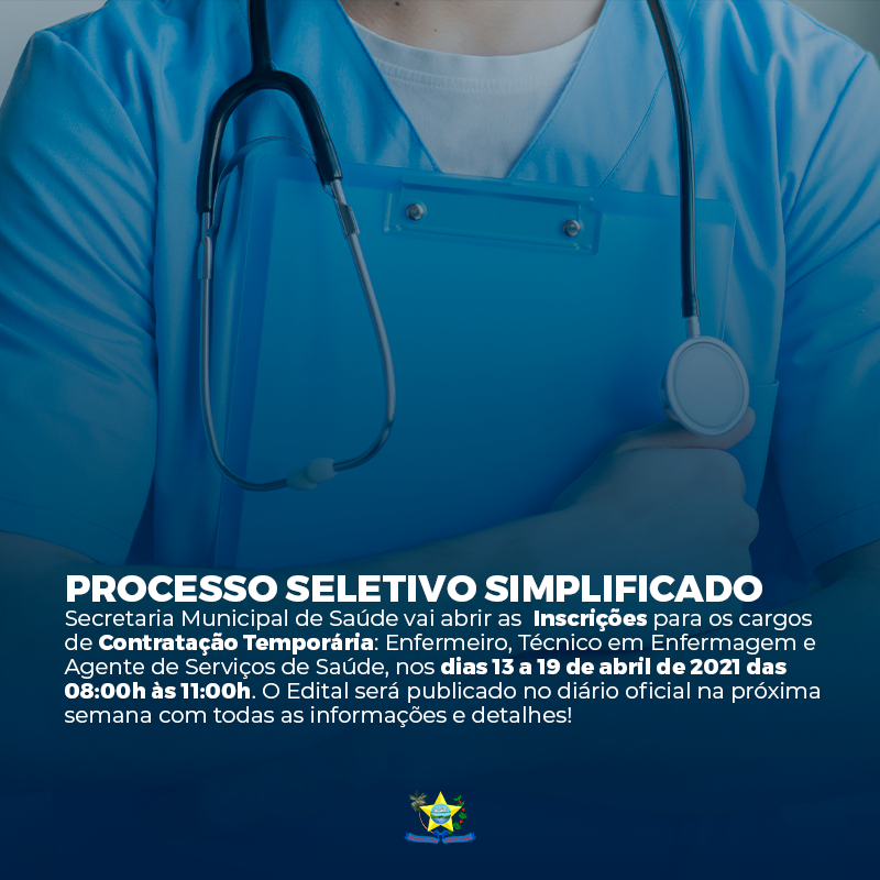 PROCESSO SELETIVO SIMPLIFICADO Secretaria Municipal de Saúde vai abrir as Inscrições para os cargos de Contratação Temporária: Enfermeiro, Técnico em Enfermagem e Agente de Serviços de Saúde, nos dias 13 a 19 de abril de 2021 das 08:00h às 11:00h. O Edital será publicado no diário oficial na próxima semana com todas as informações e detalhes!