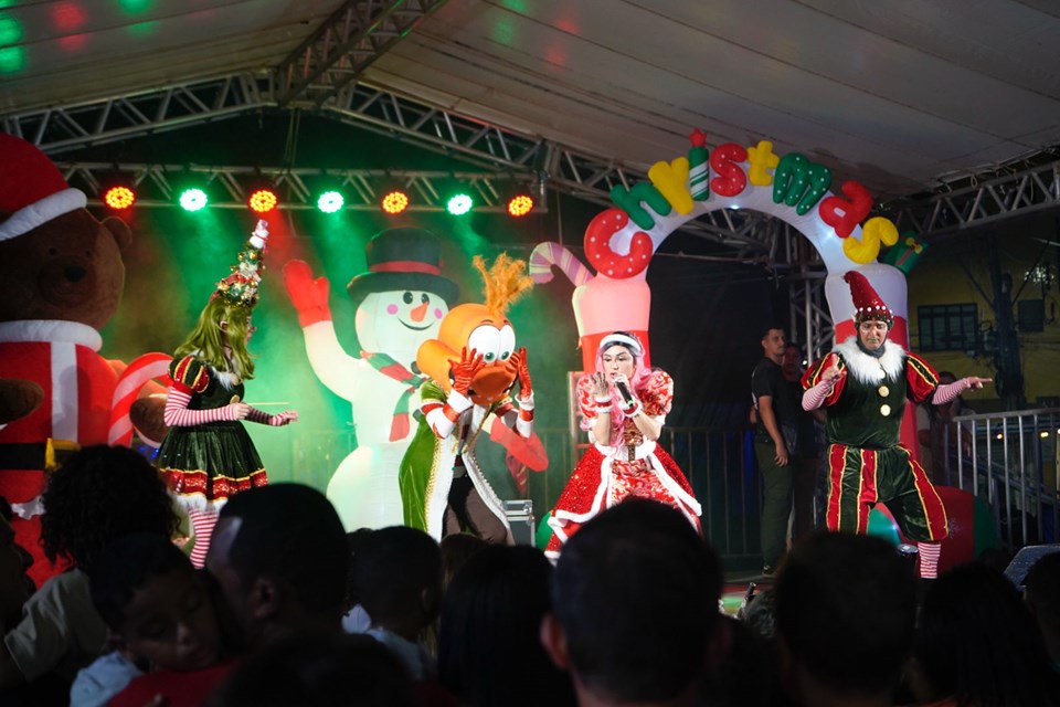 A programação teve início pela manhã, com o Papai Noel percorrendo as ruas do centro da cidade para a distribuição de doces e presentes às crianças. Já no período da noite, a Vila Natalina recebeu uma atração inédita no município. O grupo Tina Show se apresentou com um repertório de músicas natalinas e encenação infantil, promovendo interação com o público e encantando as famílias presentes na praça.